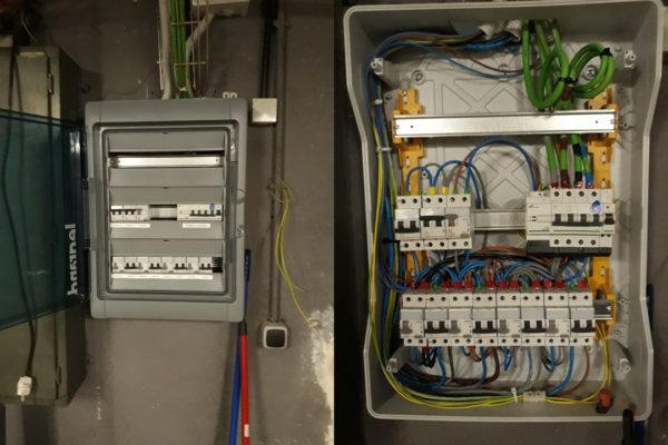 Instalación de cuatro puntos de recarga para vehículos eléctricos en garaje, compuesto por los siguientes componentes/elementos: