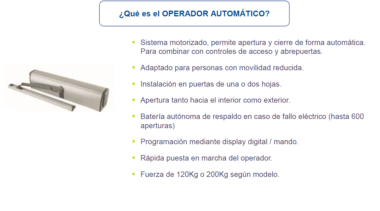 • CÓMODO. Abrir manualmente puertas supone un inconveniente o un esfuerzo costos. Esta solución permite acceder al edificio sin hacer fuerza en la puerta (cuando vamos cargados). El brazo del OPERADOR AUTOMÁTICO de PUERTA abre y cierra la puerta sin tocarla físicamente.