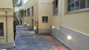 Instalación de 10 balizas de iluminación, 4 detectores de presencia y un foco para mejorar la visibilidad de la zona de Patio y entrada al Garaje desde la Calle en Edificio de Oficinas.