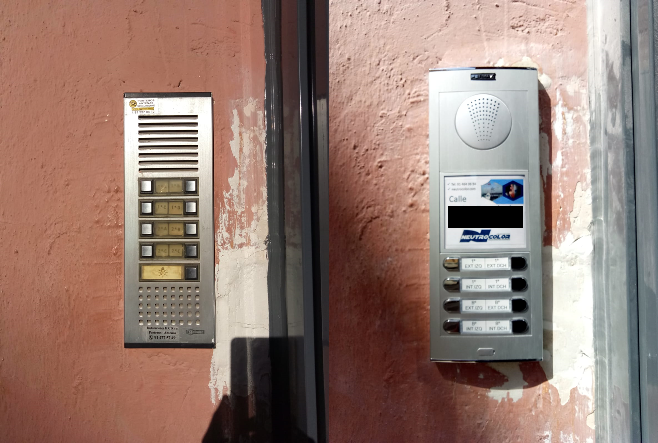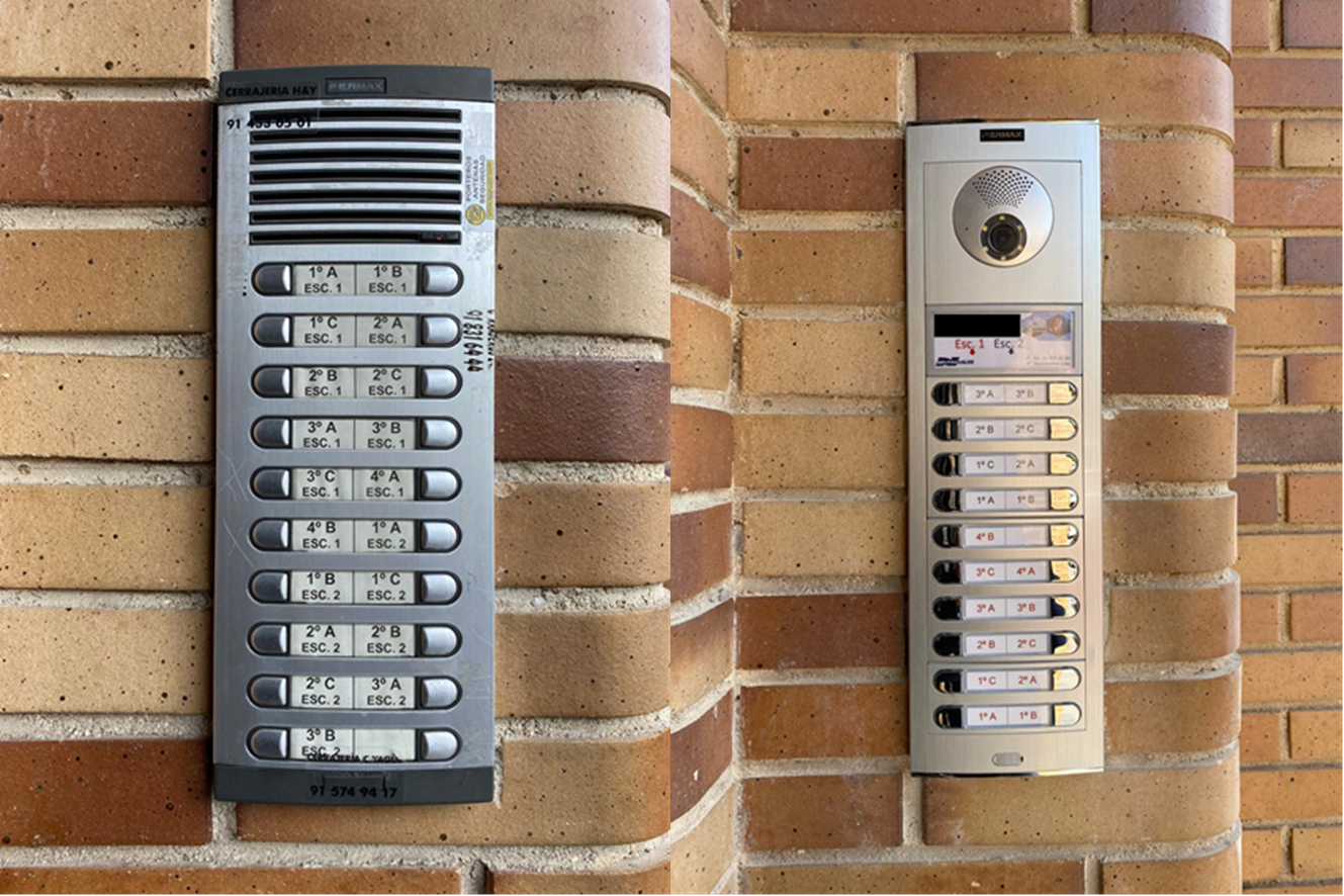 Instalación de videoportero color en la comunidad con 2 accesos generales de llamada por código y 4 placas interiores de llamada por pulsador ver completo